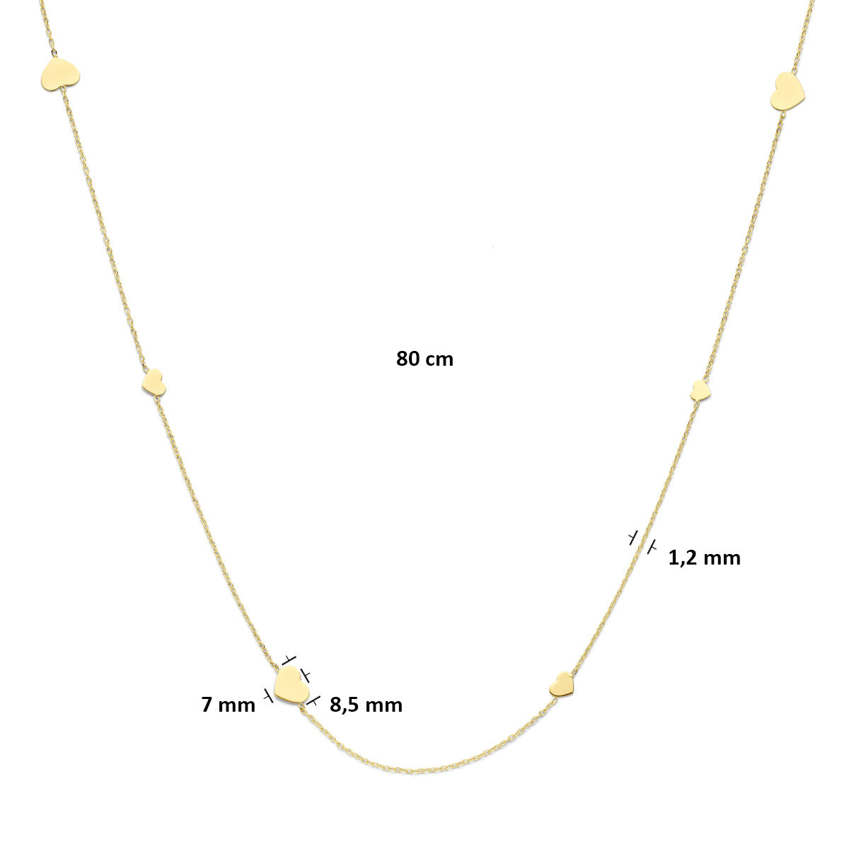 14k Geelgouden collier uitgevoerd met hartjes. Het collier heeft draaglengtes van 76-78-80cm.