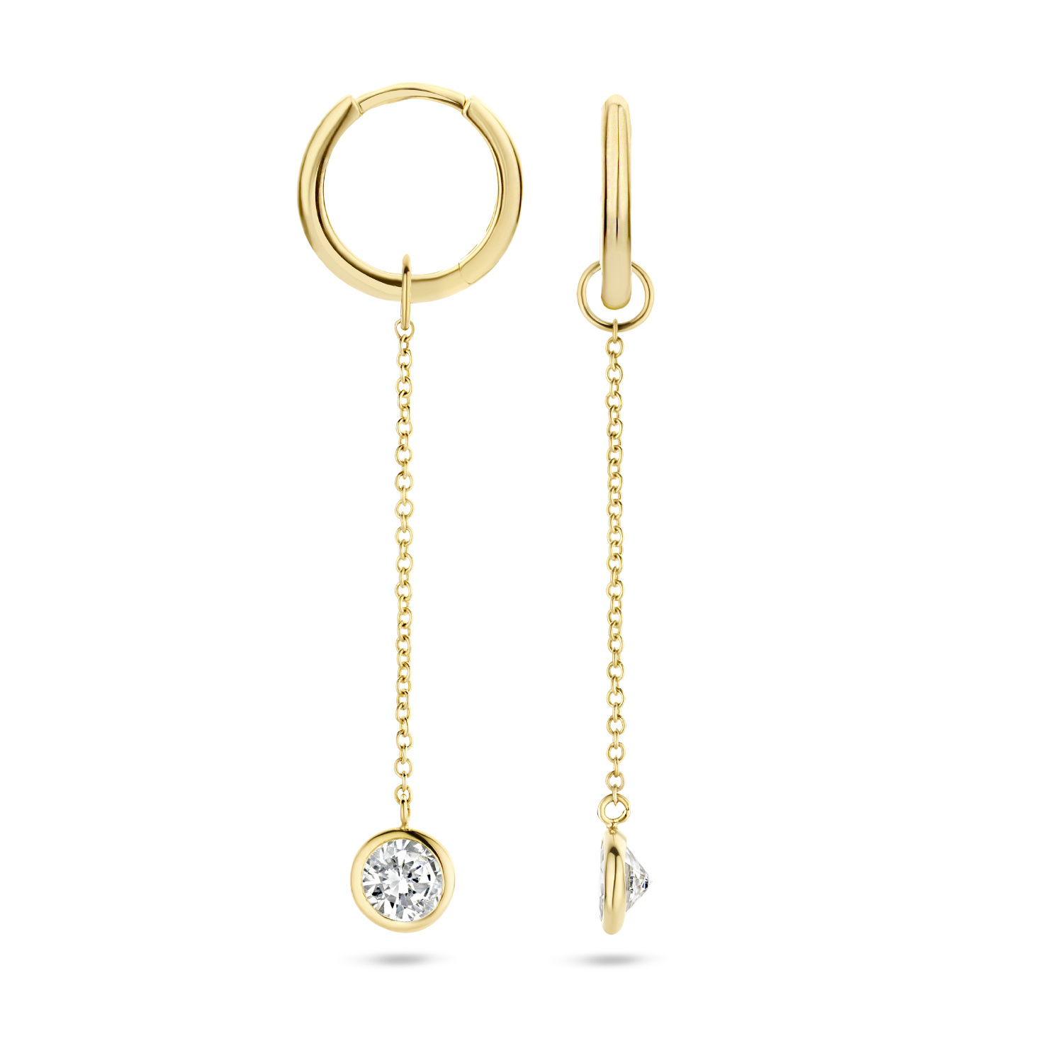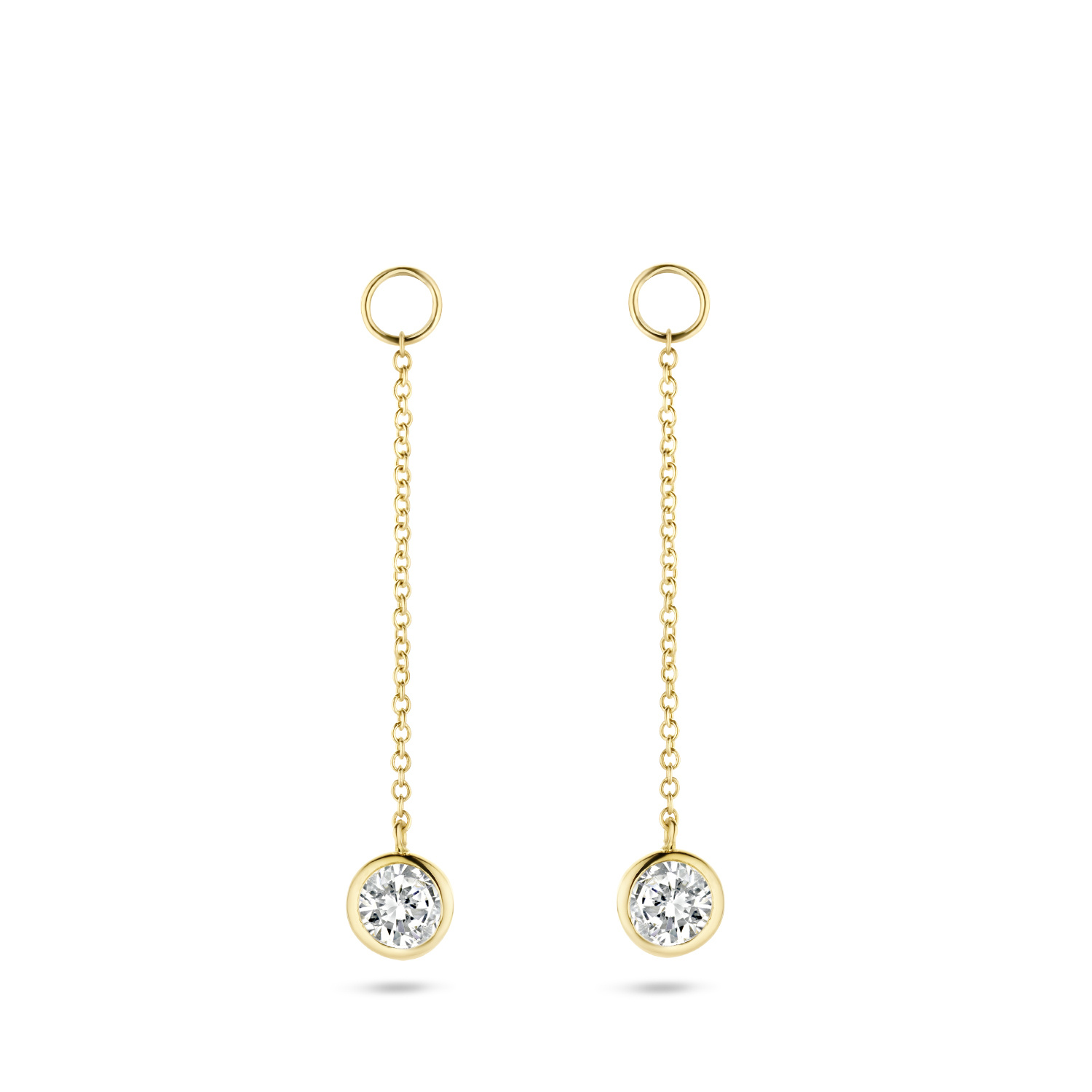 Deze sierlijke oorbedels zijn gemaakt van 14k geelgoud bezet met schitterende zirkonia en hebben een lengte van 2,8 cm. Je schuift ze eenvoudig om een oorring en ze mixen en matchen mooi met andere oorsieraden uit onze collectie.