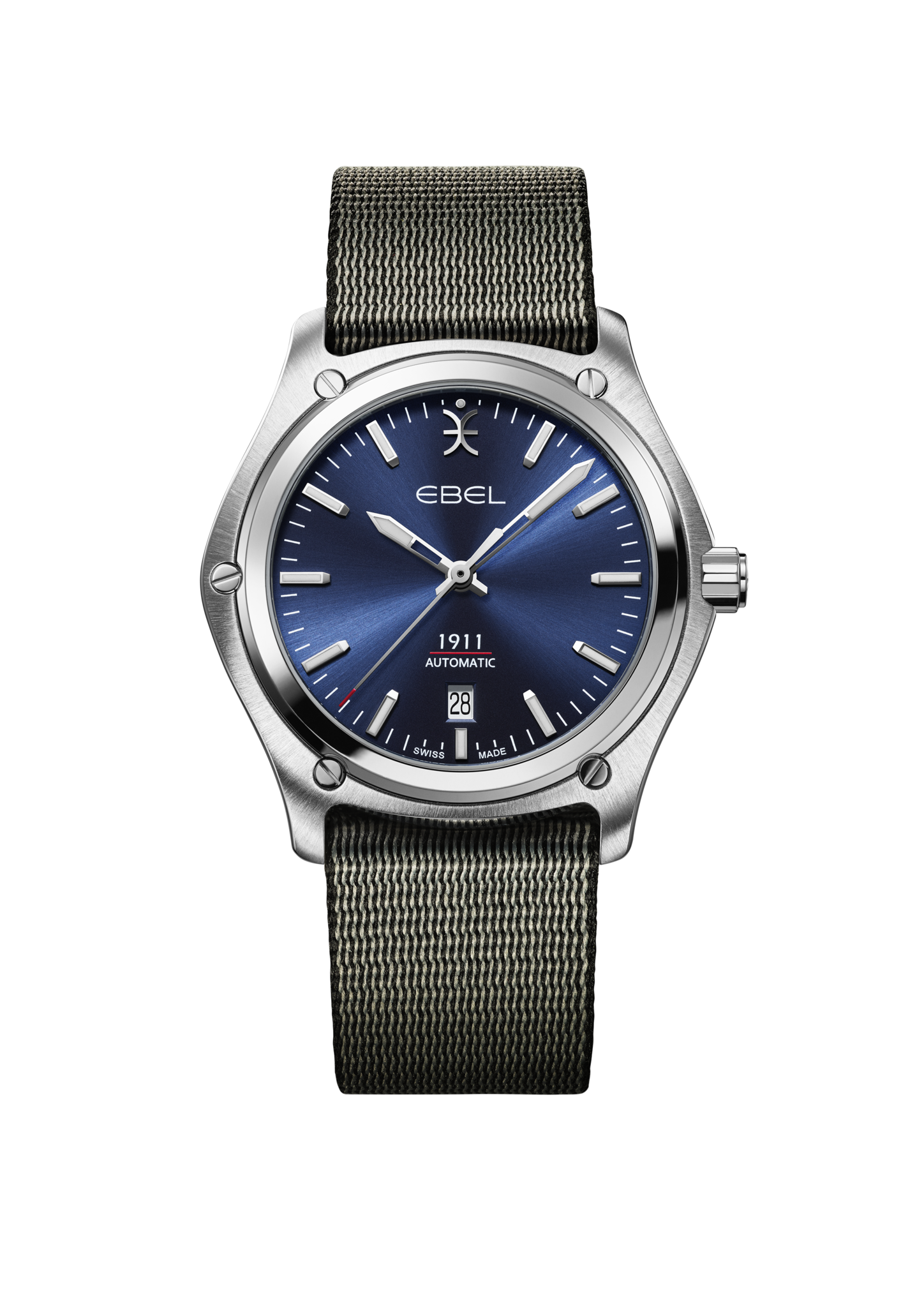 Herenhorloge EBEL 1911, roestvrijstalen kast, Ø 42 mm, blauwe galvanische wijzerplaat met aangebrachte indexen met Super-LumiNova®, datumvenster op 6:00, saffierglas met antireflectiebehandeling, roestvrijstalen armband, vouwsluiting, wordt geleverd met extra stoffen band (gemaakt van geüpcycled oceaangebonden plastic) met kurken inzetstuk, Zwitsers automatisch uurwerk, waterdicht tot 10 bar