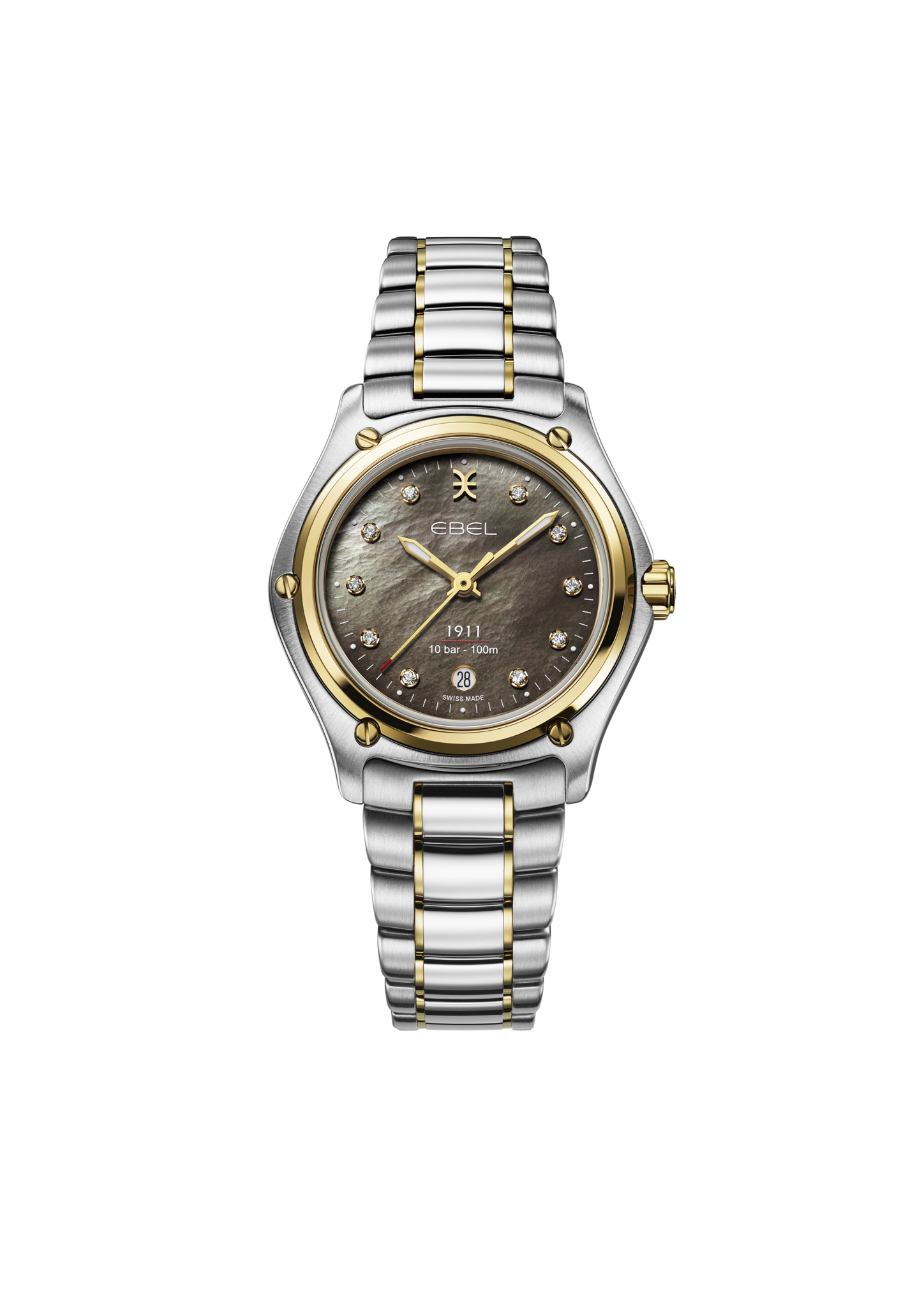 Dameshorloge EBEL 1911, kast van roestvrij staal en 18-karaats geelgoud, Ø 30 mm, donkergrijze parelmoeren wijzerplaat met 10 diamanten (0,052 ct), datumvenster op 6:00 uur, saffierglas met antireflectiebehandeling, tweekleurige roestvrijstalen schakelarmband, vouwsluiting, Zwitsers kwartsuurwerk, waterdicht tot 10 bar