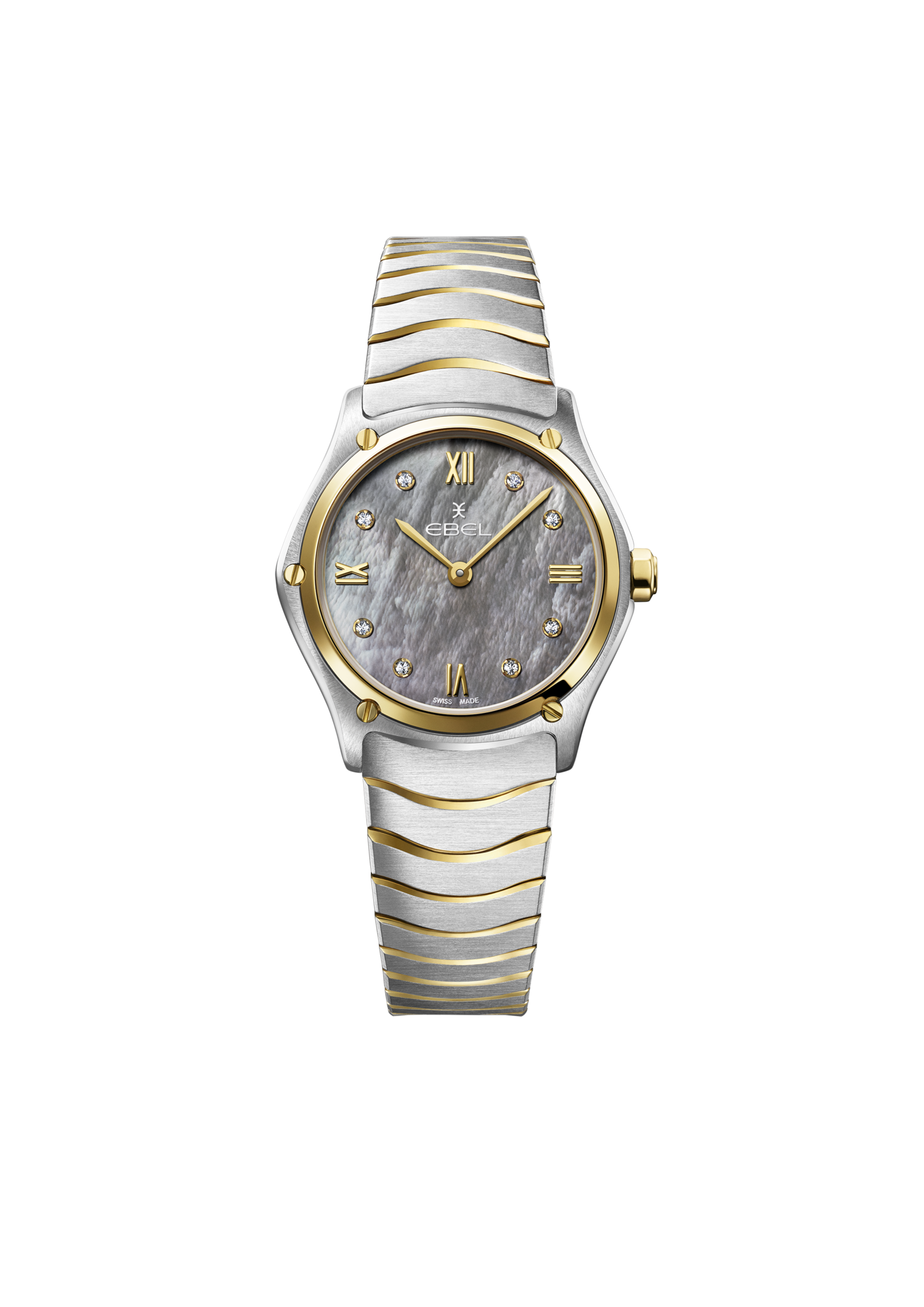 EBEL Sport Classic dameshorloge, kast van roestvrij staal en 18-karaats geelgoud, Ø 29 mm, grijze parelmoeren wijzerplaat met Romeinse cijfers en 8 diamanten (0,052 ct), saffierglas met antireflectiebehandeling, tweekleurige roestvrijstalen WAVE schakelarmband met vouwsluiting, Zwitsers kwartsuurwerk, waterdicht tot 5 bar