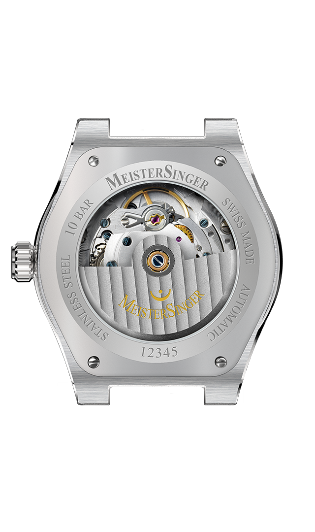 De lijnhiërarchie die typisch is voor de MeisterSinger-horloges met één wijzer, verdeelt de tijdsaanduiding ook in halve en kwartieren, waardoor het gemakkelijker wordt de tijd nauwkeurig af te lezen.