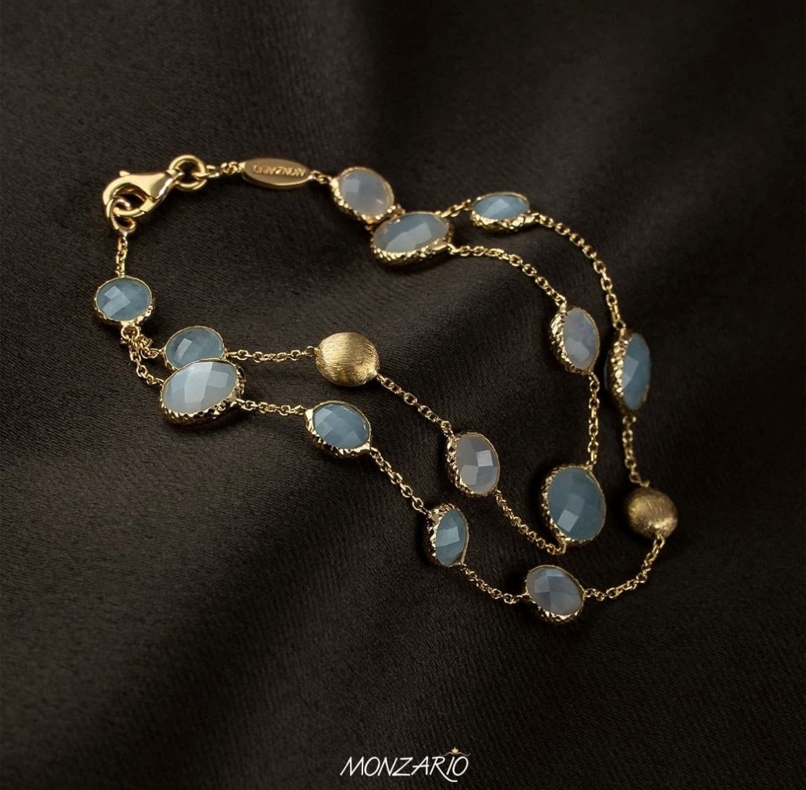 MONZARIO 1027C GEEL 14krt geelgouden fantasie collier, 2 rijen, fijn, met ronde aquamarijnen en maansteen 45 cm.