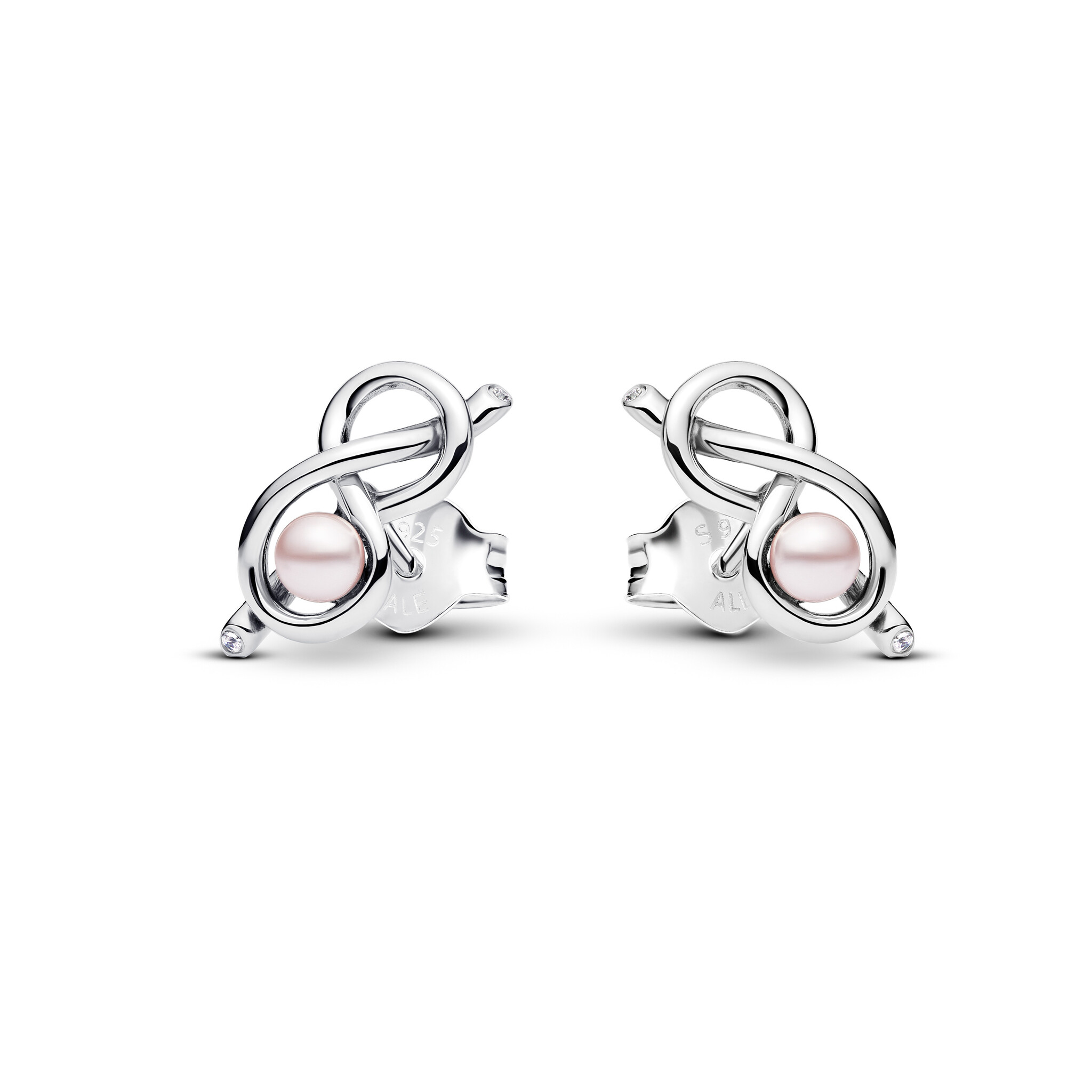 PANDORA 293761C01 Infinity knot sterling silver stud earrings with pink lacquered artificial pearl and zirconia
