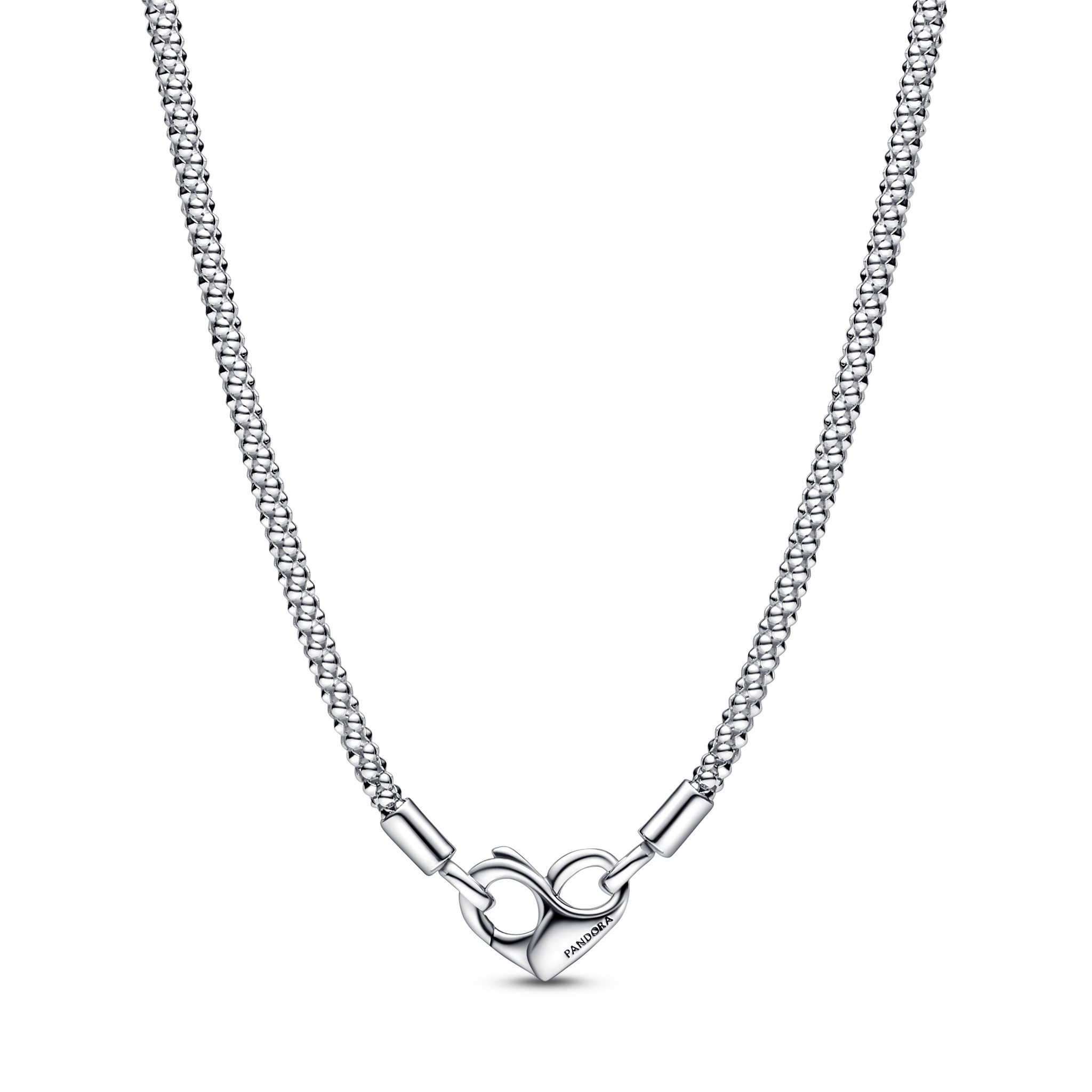 Geef je collectie een update met onze Pandora Moments Studded Chain Necklace. Deze halsketting die is hand-finished in sterlingzilver, heeft een flexibele, bewerkte ketting en een hartvormige sluiting gedetailleerd met het oneindigheidsteken dat geopend kan worden. Let op: kan worden gestyled met een Pandora Moments O-hanger of hartvormige bedelhanger in elke maat.