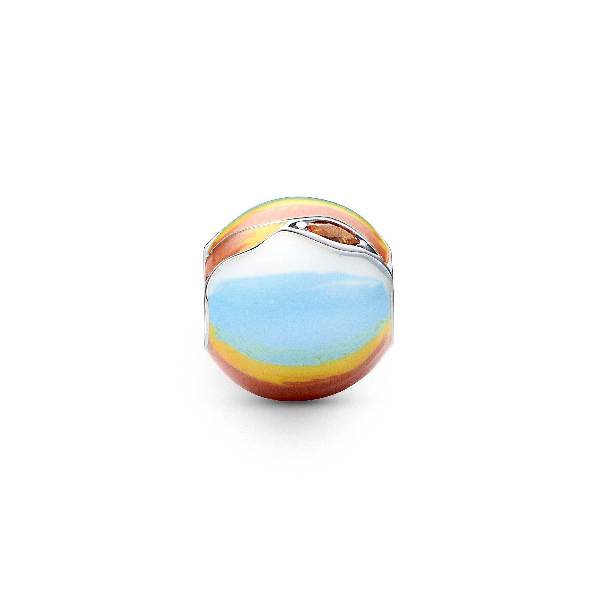 Laat de kosmische schoonheid van het zonnestelsel tot leven komen met de Planeet Jupiter Fonkelende Bedel. Mensen zijn al sinds de oudheid gefascineerd door de nachtelijke hemel - onze zonnestelsel serie haalt inspiratie uit de schoonheid van de planeten en de manier waarop ze worden weergegeven in de moderne popcultuur. Deze met de hand afgewerkte bolvormige charm heeft met de hand aangebracht email in subtiele tinten amber, geel, lichtblauw en wit, met fonkelende rijen golvende pavé om Jupiters “rivieren” voor te stellen. Een honingkleurige marquise-vormige steen aan één kant stelt het beroemde “oog van Jupiter” voor. Voeg hem toe aan je sieraden voor een elegante touch bij elke styling.