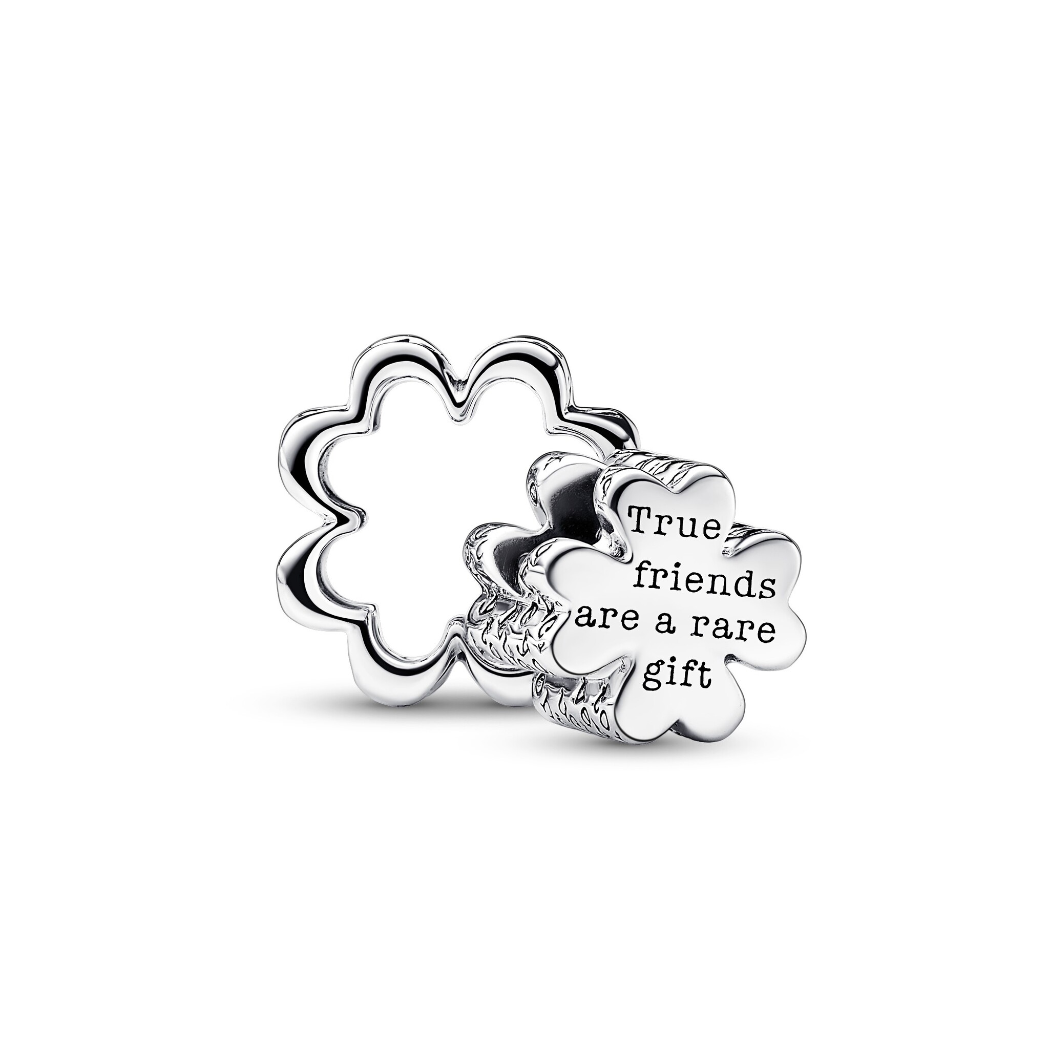 Verdubbel het geluk met de deelbare klavertjevierbedel. Deze sterlingzilveren klavertjevierbedel is meer dan je op het eerste gezicht zou denken. Het klavertje is deelbaar van buitenaf en kan dan als bedel gedragen worden. Het is het perfecte sieraad om te geven aan iemand die wat extra geluk nodig heeft. Het binnenste klavertje is gegraveerd met: 'True friends are a rare gift' op de achterzijde en 'Lucky to have you' op de zijkant. Het heeft hartvormige bladeren en groene man-made kristallen in twee verschillende tinten. Deze Pandora Moments bedel barst van de positiviteit en symboliek en staat voor geloof, hoop, liefde en geluk. Wie wil dat nou niet?