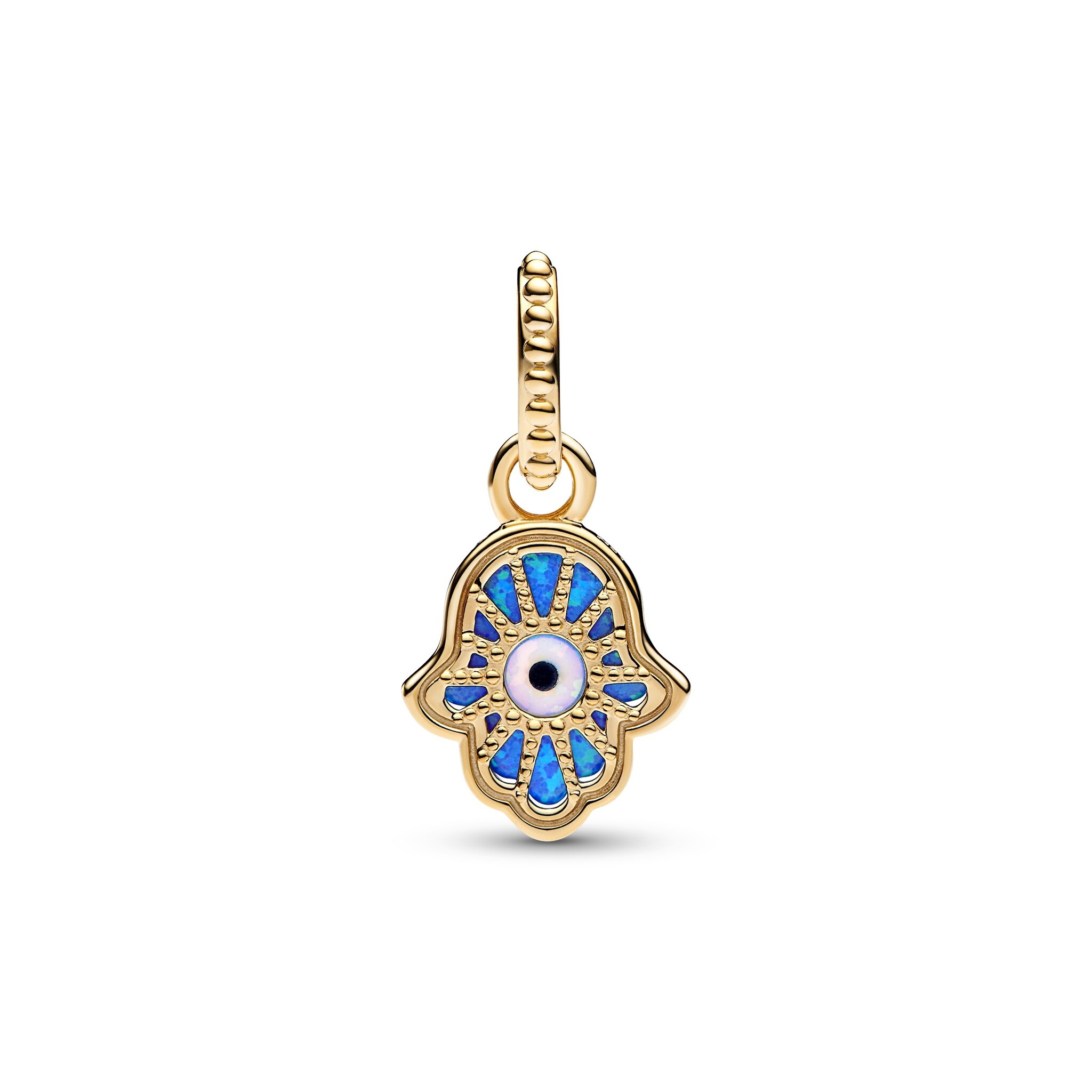 PANDORA Hamsa hand 14k gold-plated dangle with deep blue and white lab-created opal and black man-made composite 762699C01