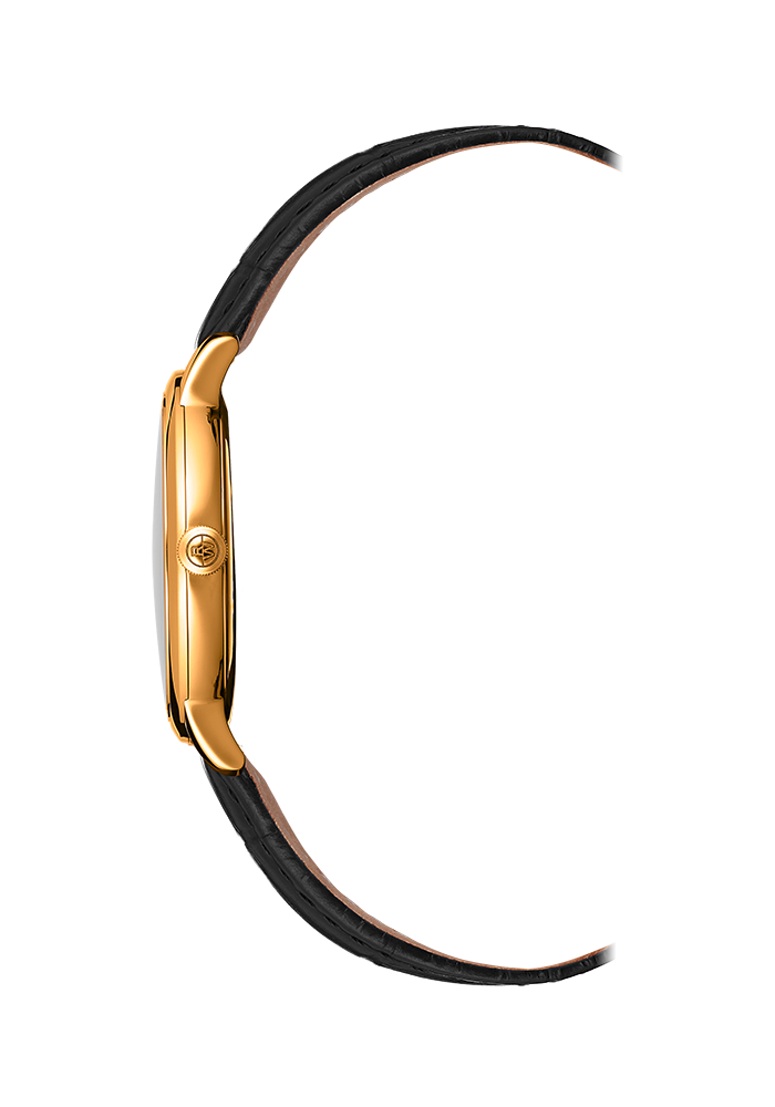 Dit toccata herenhorloge is uitgerust met een quartz uurwerk en heeft een roestvrijstalen kast van 39 mm met geelgouden PVD-plating en een datumvenster op 3 uur. De wit gelakte wijzerplaat is bezet met toegepaste Romeinse cijferindexen en heeft een cijferring die de leesbaarheid bevordert. Als aanvulling op deze moderne klassieker zijn er alligatormotieven aan de band toegevoegd.