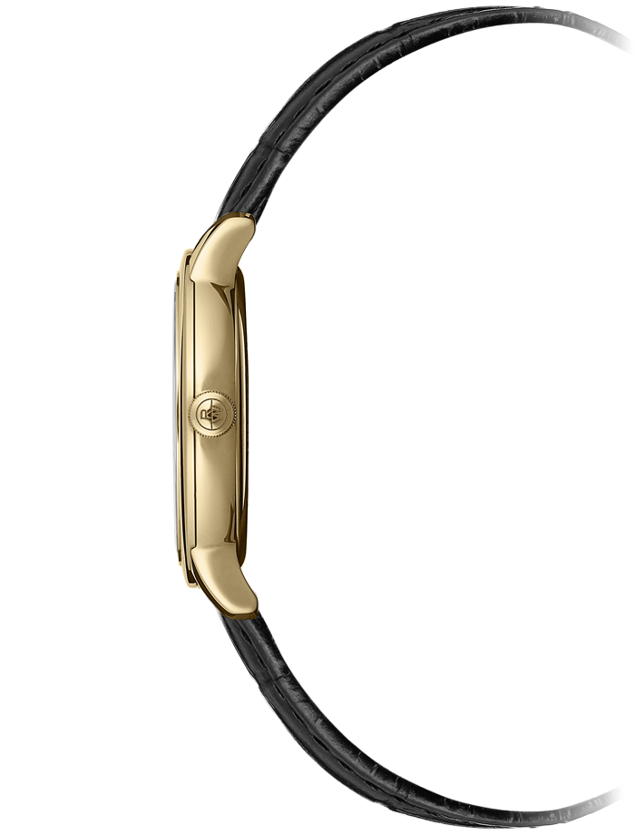 Dit toccata dameshorloge is uitgerust met een quartz uurwerk en heeft een roestvrijstalen kast van 29 mm met geelgouden PVD-plating en een datumvenster op 3 uur. De wit gelakte wijzerplaat is bezet met toegepaste Romeinse cijferindexen en heeft een cijferring die de leesbaarheid bevordert. Als aanvulling op deze moderne klassieker zijn er alligatormotieven aan de band toegevoegd.