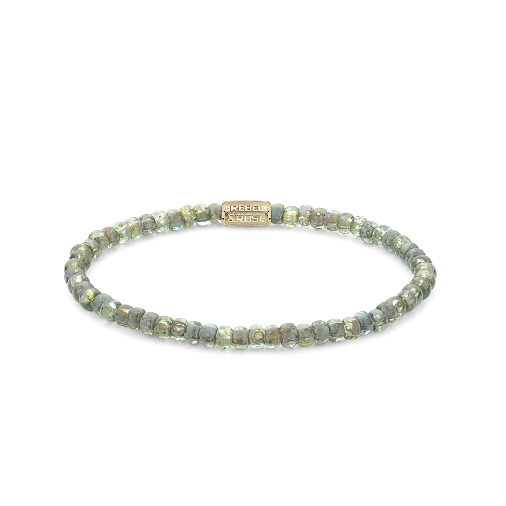 Bead armband, handgemaakt van 4mm kralen van glas (Glass Rocks) met een 18 karaat goud ion-plated edelstalen sluiting. Onze ‘Rocks’ staan bekend om hun superieure kwaliteit, uniformiteit in afmetingen en bijzondere kleurschakeringen. Omdat de kleuren in het glas zijn gemengd, blijven ze extra lang mooi. De asymmetrisch geplaatste rijgopening in de kralen, zorgt voor een speels en gevarieerd en effect op de pols.
