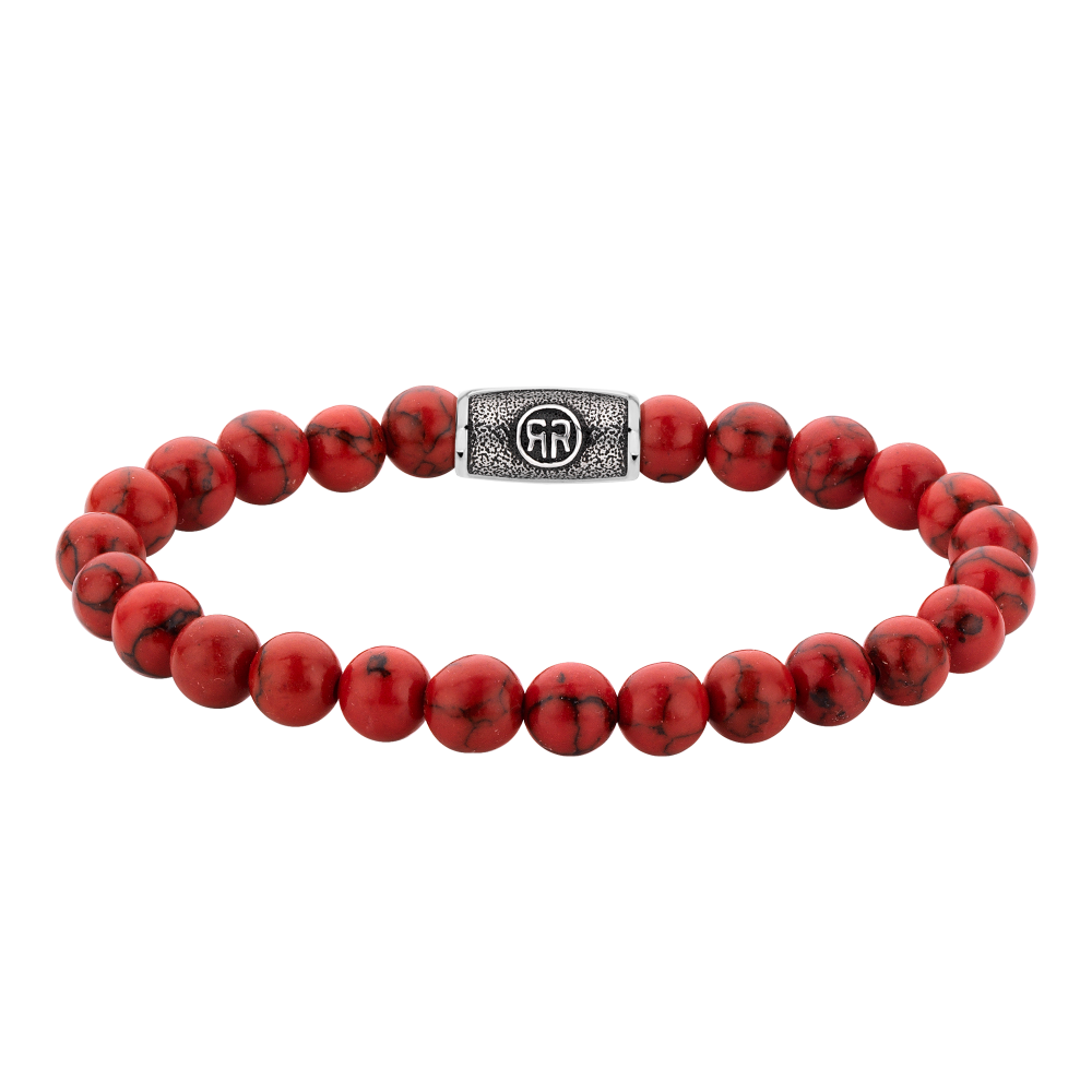 Edelstenen bead armband, handgemaakt van 8mm Turquoise Red stenen. De sluiting is van stainless steel en de vintage look is handmatig aangebracht. Het Rebel & Rose sieraad is makkelijk te combineren met andere zilveren, leren of kralenarmbanden.