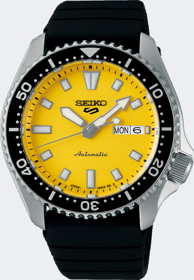 Seiko 5 Sports Horloge SRPL87K1 / 42.5mm, staal/rubber zwart, automatisch uurwerk, gele wijzerplaat, dag/datum, 10 ATM waterbestendig.