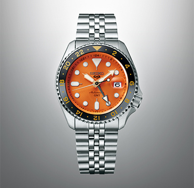 De leesbaarheid van deze uitvoering wordt geperfectioneerd door de helder zwarte GMT-wijzer, die contrasteert tegenover de oranje wijzerplaat. Net als de tijdwijzers en indexen, is de GMT-wijzer voorzien van een royale laag Lumibrite om ook een optimale leesbaarheid bij weinig licht te garanderen. Naast het internationale gemak van de GMT-functie is het horloge ook voorzien van een draaibare bezel, die in twee kleuren is uitgevoerd om in één oogopslag de dag- en nachturen te kunnen onderscheiden. De bezel is gemaakt van Seiko's Hardlex-glas om het hoge niveau van duurzaamheid te leveren waar de Seiko 5 Sports-collectie om bekend staat.