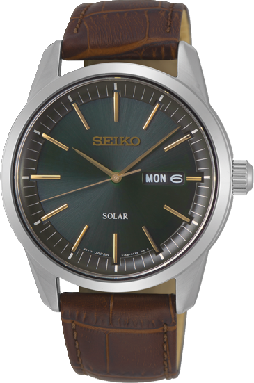 Seiko SNE529P1 Solar, staal/leer bruin, groene wijzerplaat, dag/datum, saffier glas, 10ATM