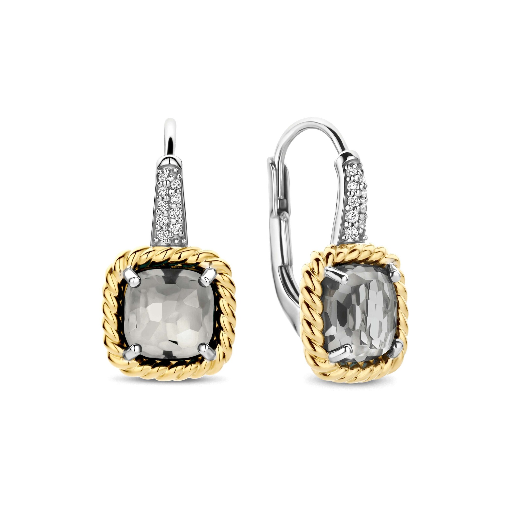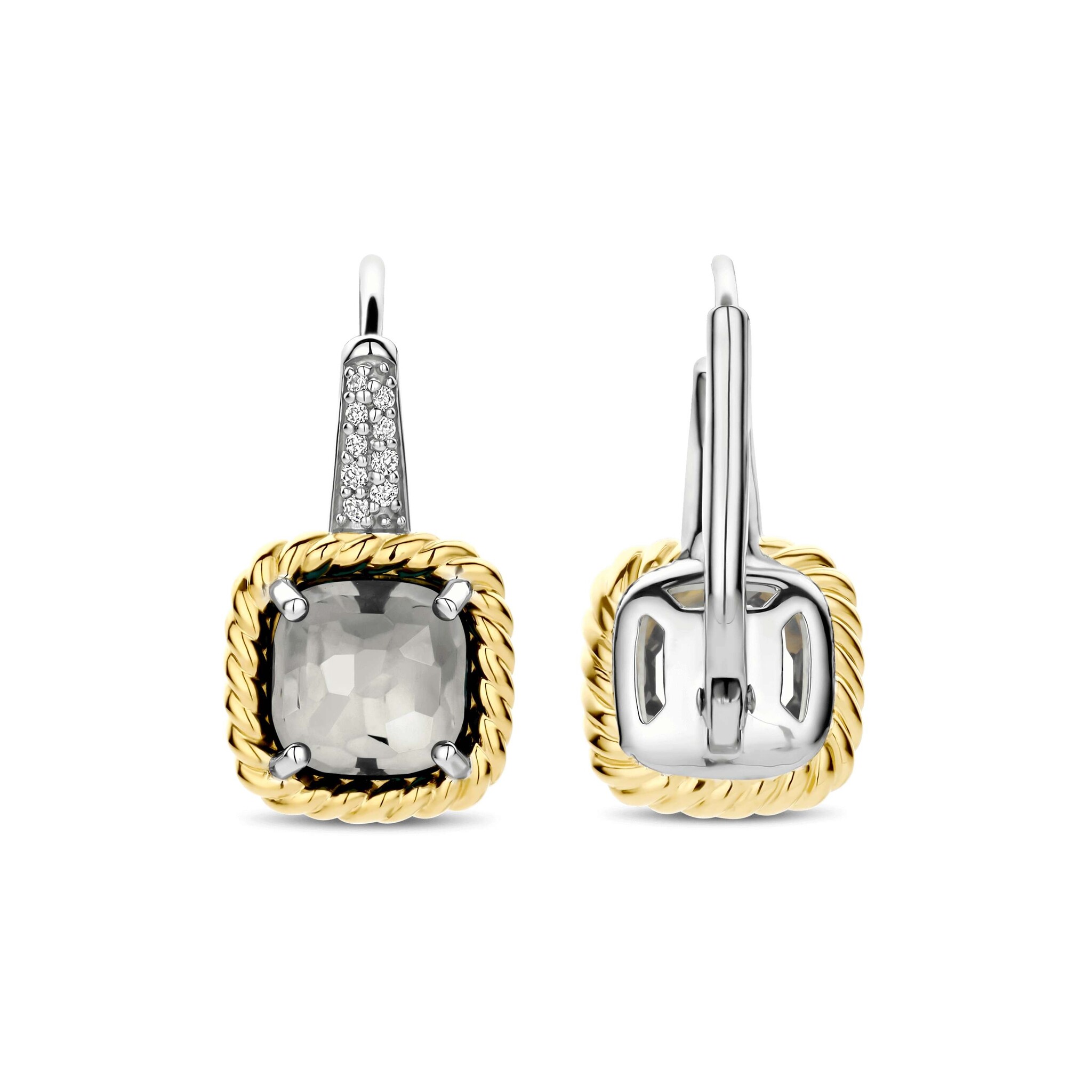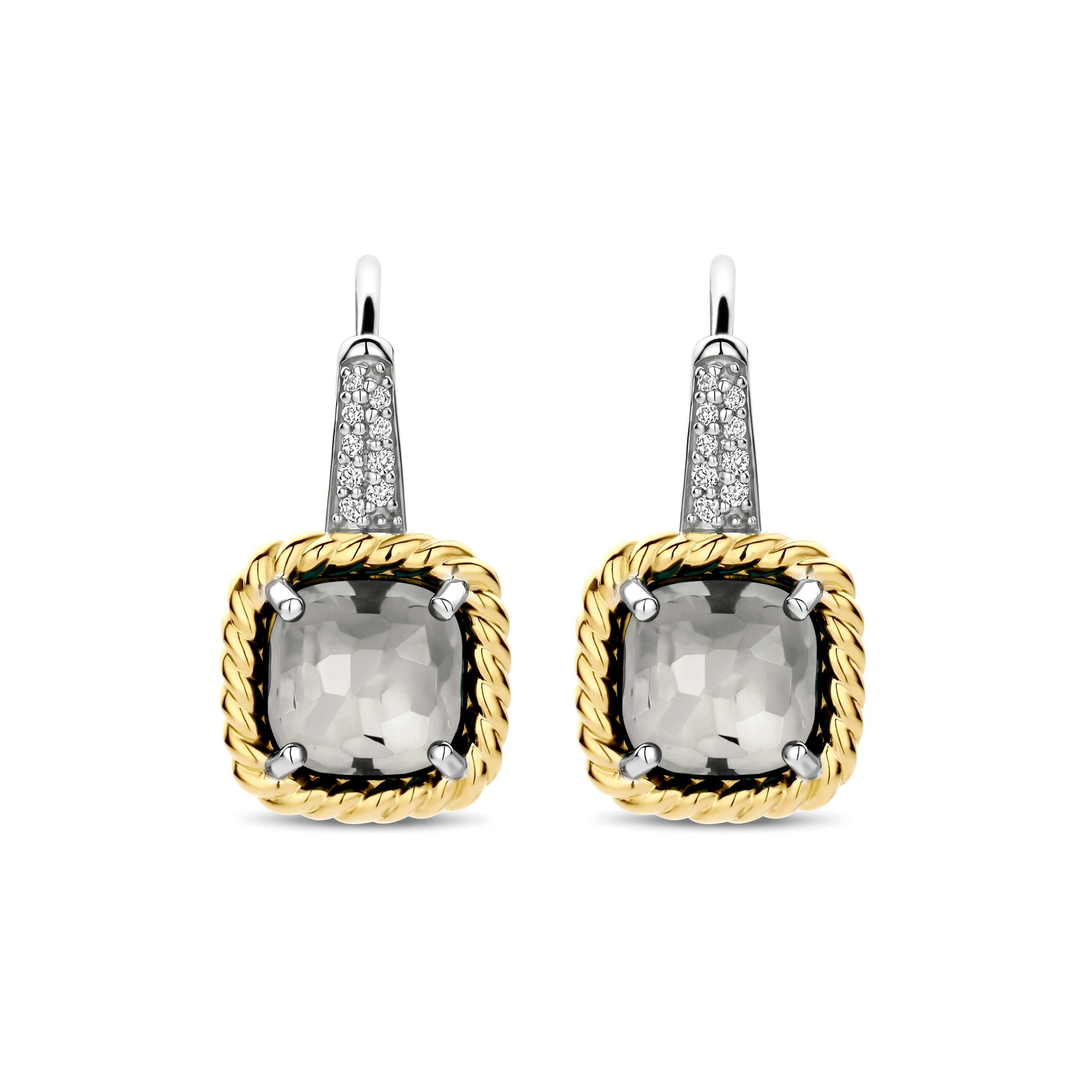 TI SENTO MILANO 78042GG Zilver gerhodineerde oorhaken met sluiting, grijze vierkante zirconia in vergulde rand, en zirconia's