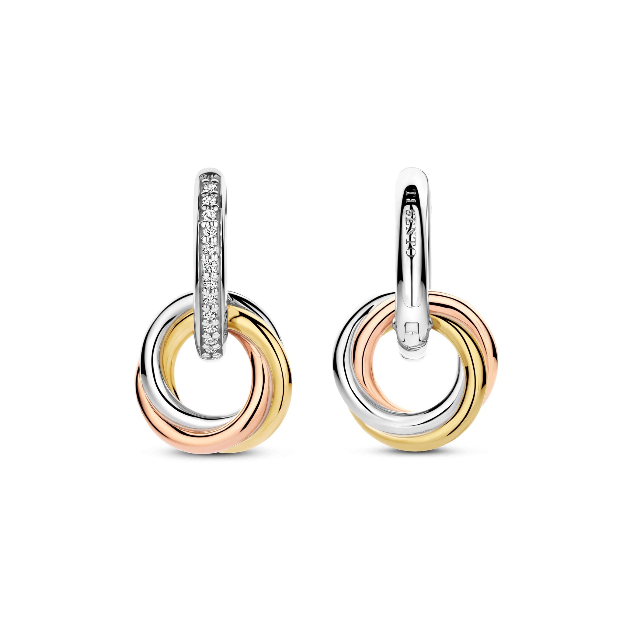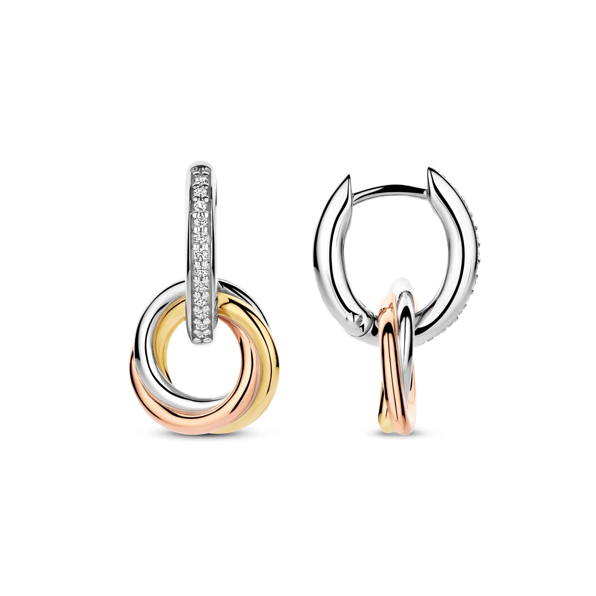 TI SENTO MILANO 7857ZT Zilver gerhodineerde ovale klapcreolen met zirconia's en tri-color hangers, 3 ringen in elkaar