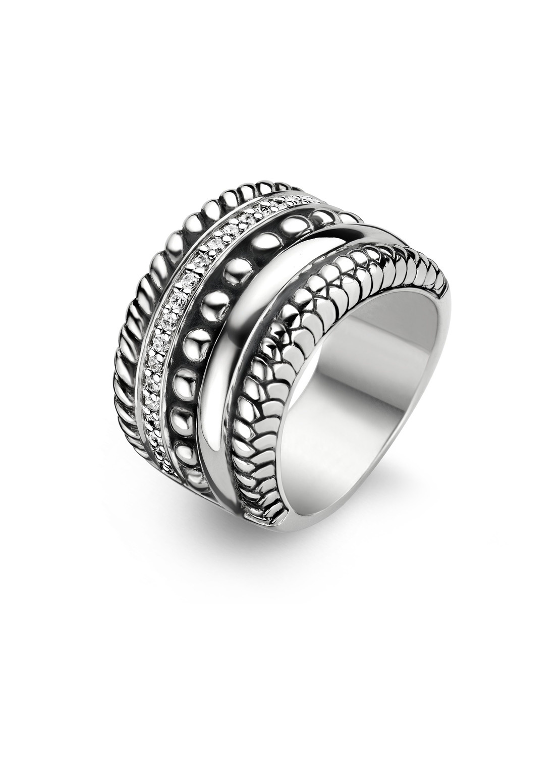 TI SENTO MILANO 1835ZI Zilveren gerhodineerde ring, 5-rijig, gedraaid/schub/glad/zirconia's/pareldraad