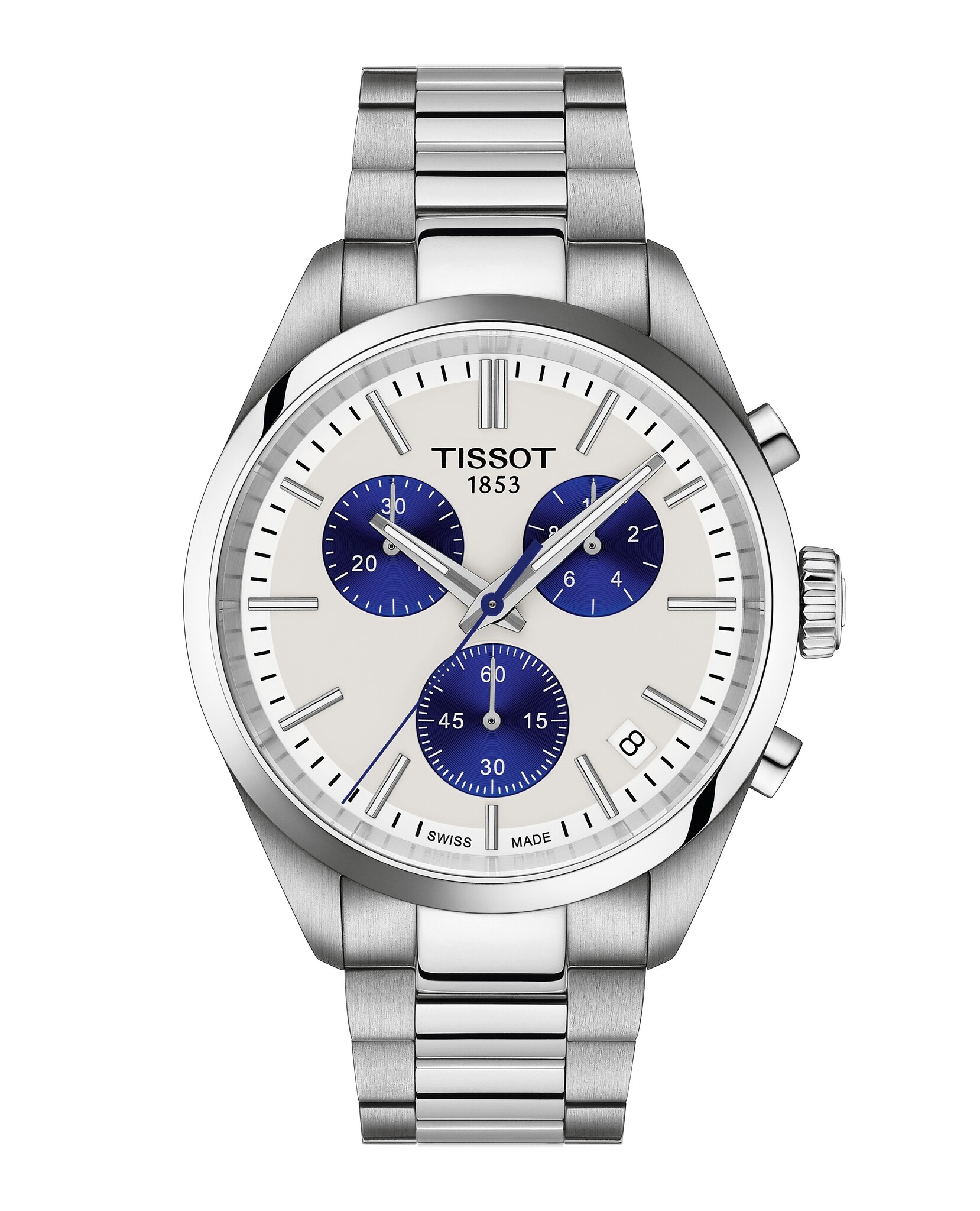 TISSOT PR 100 CHRONOGRAPH T150.417.11.011.00 / 40mm / 40mm, staal/staal quartz, chronograaf, wit/blauw wijzerplaat, datum, 10ATM