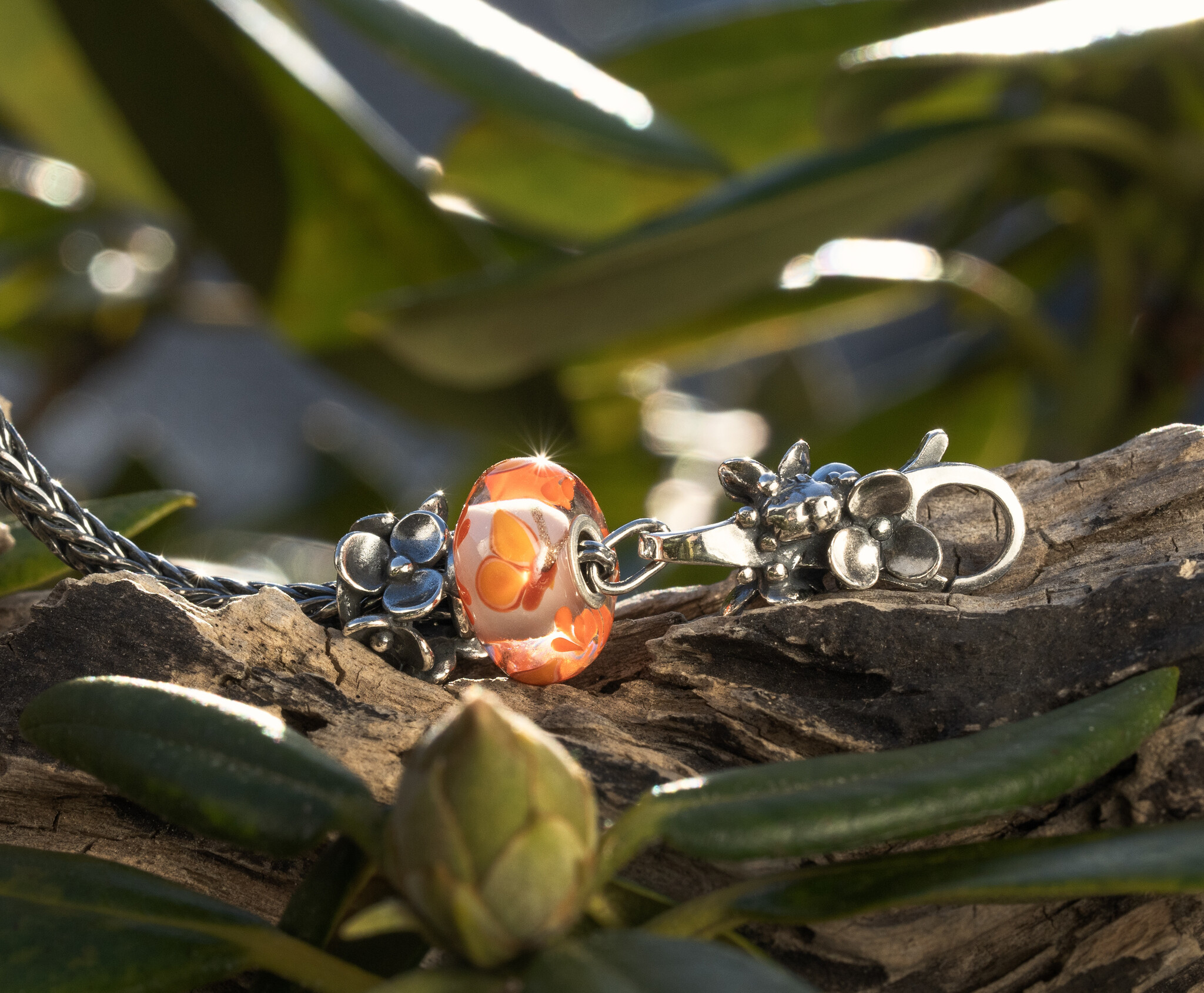 De armband bevat een fleurige glaskraal met oranje vlinders, een zilveren bloemenkraal en een sluiting met bloemen, waar het gezichtje van een fee tussen verstopt zit.