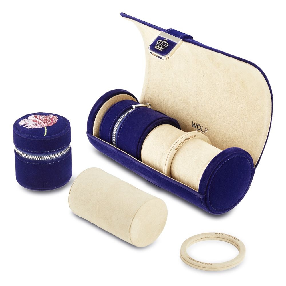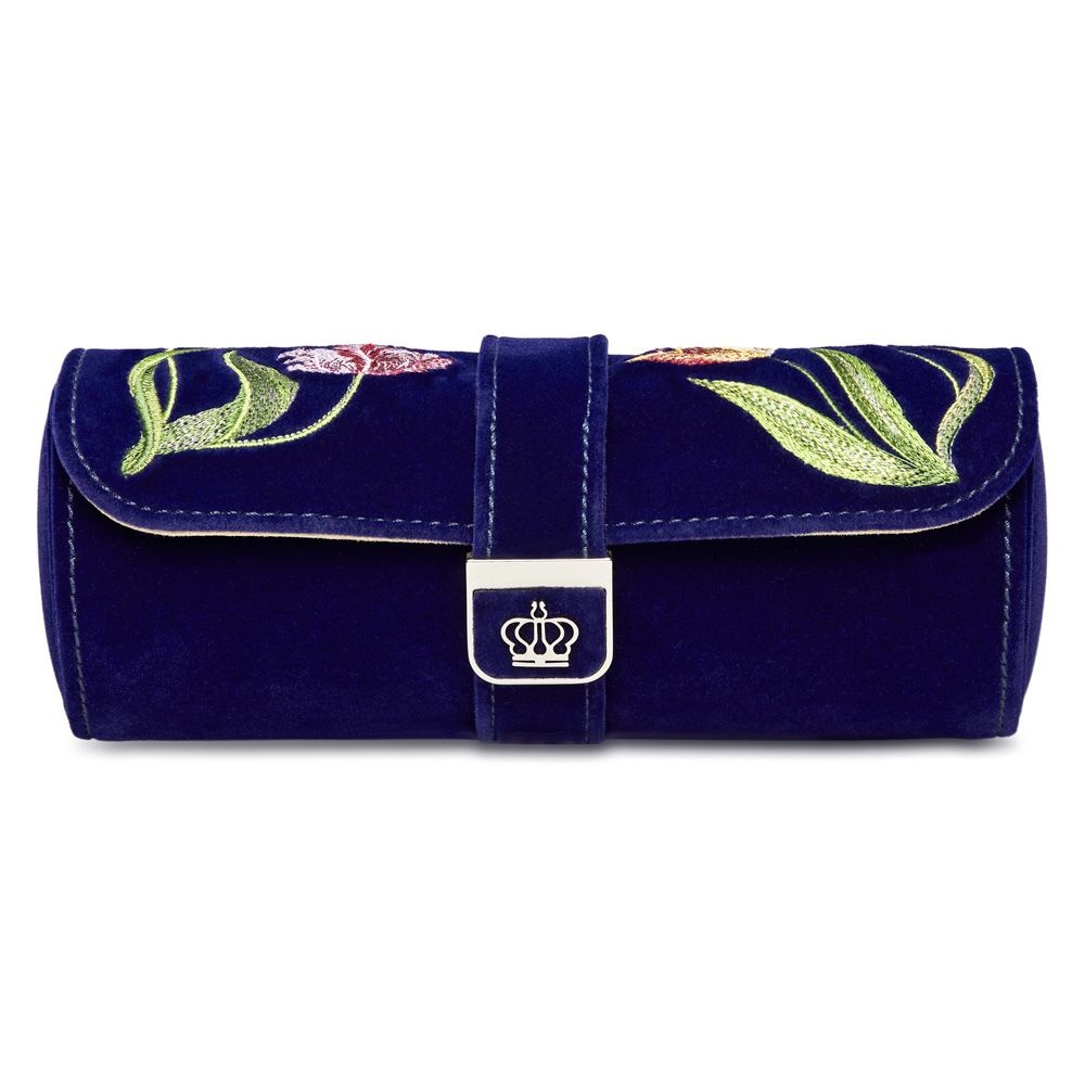 Diepblauwe fluwelen Double Watch Roll met uitgebreide tulpenborduursels aan de buitenkant, inclusief kleine fluwelen geborduurde sieraden, ritssluiting en ruimte voor 2 horloges met WOLF's gepatenteerde Watch Guard. Organiseer je horloges en sieraden in stijl. Inclusief LusterLoc™ anti-aanslag voering en zilveren afwerking sluiting en details.