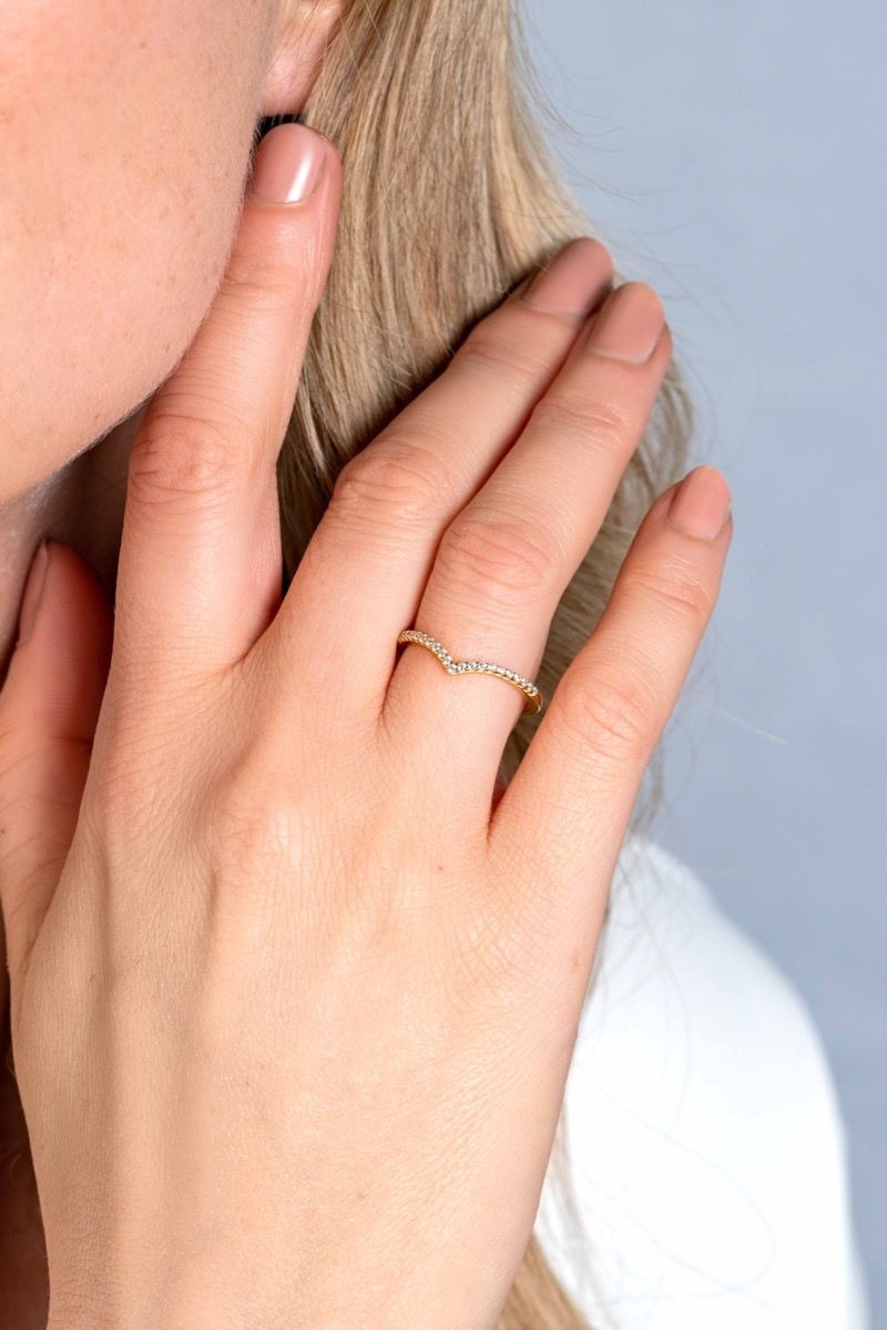 ZINZI Gold 14 karaat gouden V-ring van 1,4mm breed en bezet met 20 witte zirconia's in chique railzetting. Gemakkelijk te combineren met andere ZINZI Gold ringen aan de vinger. Vervaardigd van geheel 14 karaat goud (585).