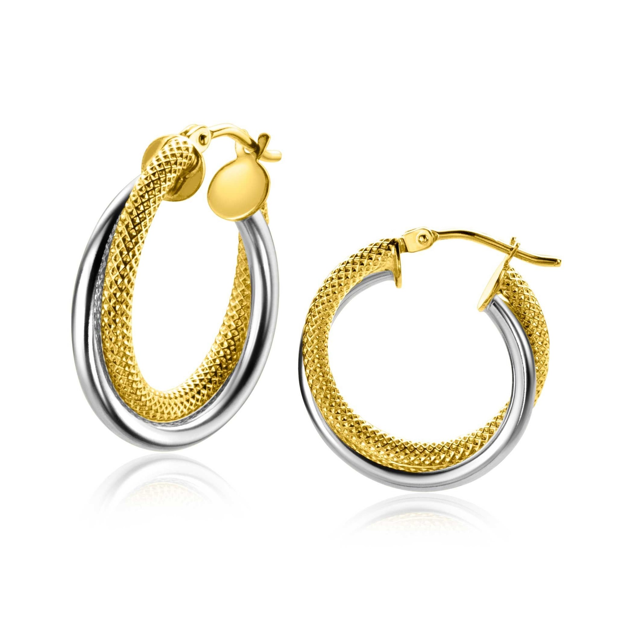 ZINZI Gold 14 karaat gouden bicolor oorringen 19mm waarbij sierlijk een bewerkte en een gladde buis over elkaar lopen. Geeft een mooie multi-look uitstraling aan het oor. Voorzien van een handige bovensluiting. Vervaardigd van geheel 14 karaat goud (585).